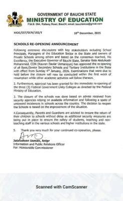 Furthermore, the decision includes the immediate reopening of the three Federal Government Unity Colleges located within Bauchi State, aligning with directives from the Federal Ministry of Education.
