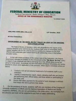 In line with the Labour Laws of the Federation, the government has instructed all Vice-Chancellors of Federal Universities to strictly enforce the “No Work, No Pay” policy by carrying out the following: