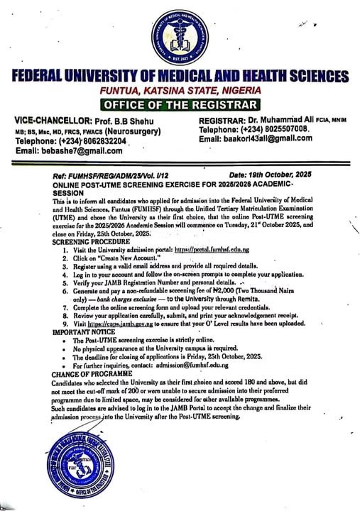 The Federal University of Medical and Health Sciences, Funtua (FUMHSF) invites suitably qualified candidates who selected the institution as their first choice in the 2025 Unified Tertiary Matriculation Examination (UTME) to apply for the Post-UTME screening exercise for the 2025/2026 academic session.