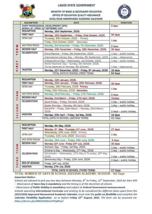 The Lagos State Ministry of Basic and Secondary Education (MB&SE) has officially released the Approved 2025/2026 Harmonised Academic Calendar for all schools below the tertiary level. This mandatory calendar applies to all public and private schools operating across Lagos State.
