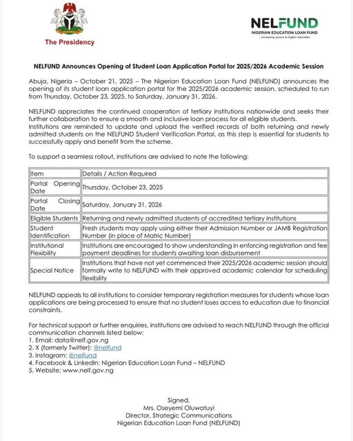 NELFUND has confirmed that additional details regarding eligibility criteria, repayment procedures, and application timelines will be released through its official communication channels in the coming days.