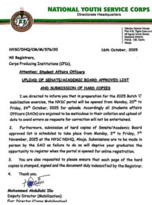 After the online upload, the submission of hard copies of the Senate/Academic Board Approved List will take place from Monday, 3rd to Friday, 7th November 2025 at the NYSC National Directorate Headquarters (NDHQ), Abuja.