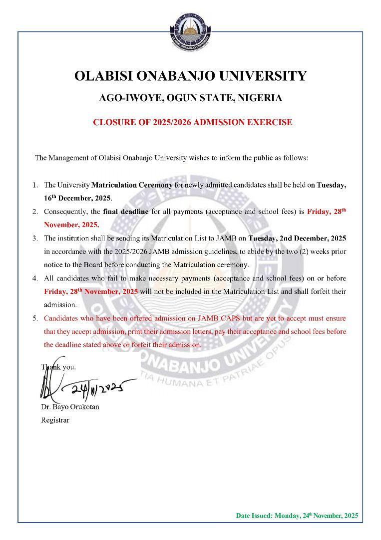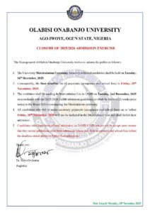 The Management of Olabisi Onabanjo University (OOU) formally notifies the general public and all newly admitted candidates for the 2025/2026 academic session that they definitively closed the admission and registration exercise.
