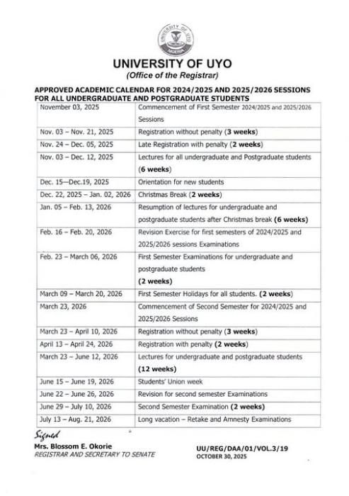 The University of Uyo (UNIUYO) has officially released the academic calendar for the 2024/2025 and 2025/2026 sessions. According to the university, the first semester begins on Monday, November 3, 2025, for all undergraduate and postgraduate students, including fresh students.