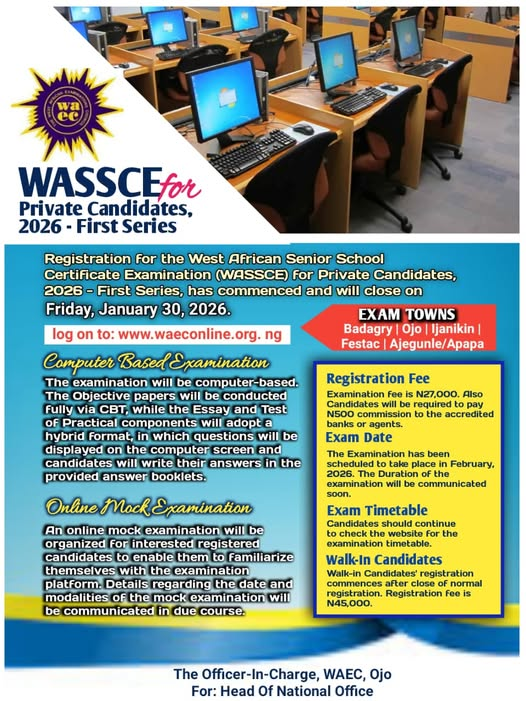 The West African Examinations Council (WAEC) officially opened the portal for the WASSCE for Private Candidates, 2026 – First Series. Intending candidates should complete their WAEC GCE 2026 First Series Registration before the formal closing date on Friday, January 30, 2026. This exam series provides a critical opportunity for students to upgrade their results early in the year.