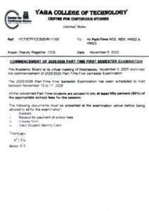 Yaba College of Technology (YABATECH) has announced the start of the Part-Time First Semester Examination for the 2025/2026 session. The notice came from the Centre for Continuous Studies (CCS) through an internal memo dated November 5, 2025, and signed by the Deputy Registrar, Mr. Bolaji O.C.